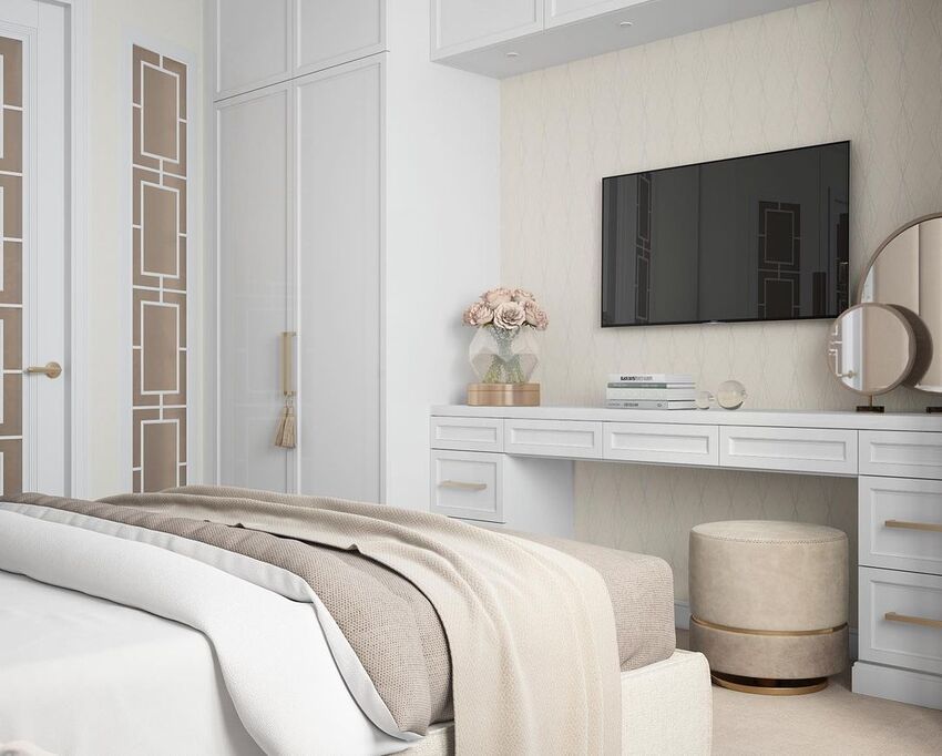 Белый. Этот цвет считают универсальным, так как он создает уникальный тандем со всеми оттенками бежевого. Отлично смотрится белый с кофейным, кремовым, молочным, соломенным. В белом цвете может быть изготовлена кровать, туалетный столик, комод. Даже текстильные принадлежности могут быть белоснежными (чаще всего тюль).
