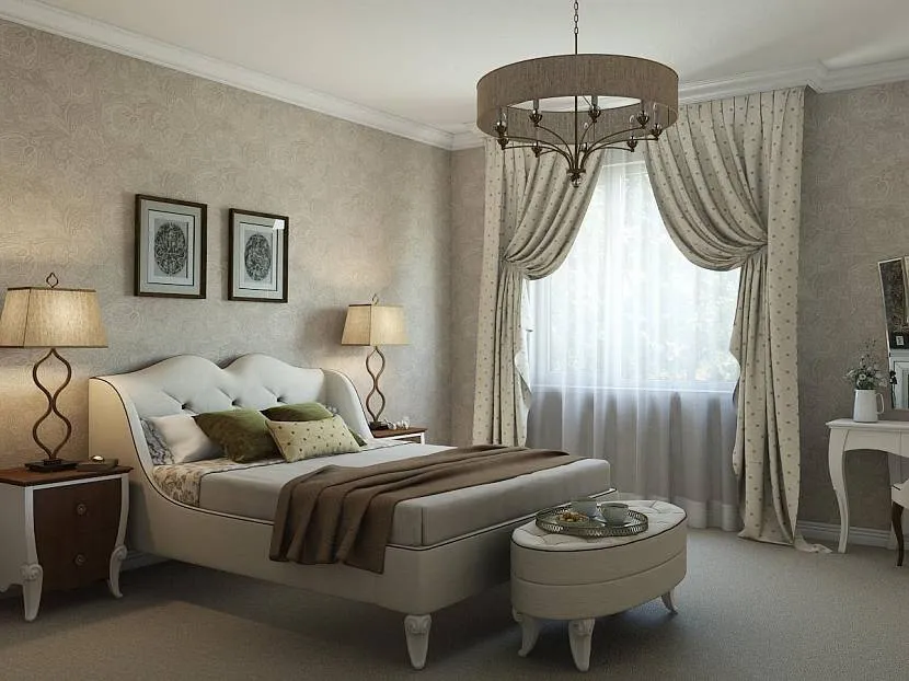 Воплощение классического дизайна бежевой спальни обойдётся в довольно внушительную сумму.