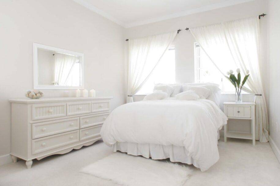 Для того, чтобы белая спальня стала уютной и комфортной, комнату декорируют текстилем из натурального хлопка, льна или шерсти. Придать интерьеру неповторимости и добавить в него ярких красок, можно при помощи контрастных подушек, пледов или покрывал.