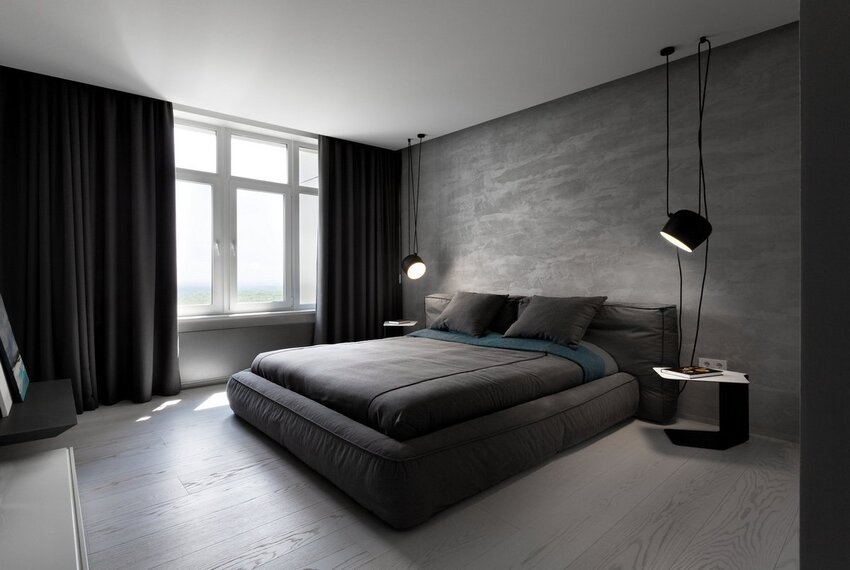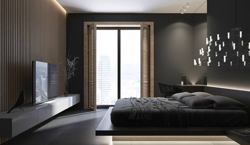 Для данного варианта типичны вертикальные жалюзи, черно-белые фото, необычное покрывало на кровать, но неяркое. А для устранения излишней серьезности применяются округлые дополнительные предметы интерьера. Возможно обустройство мебелью без острых углов.