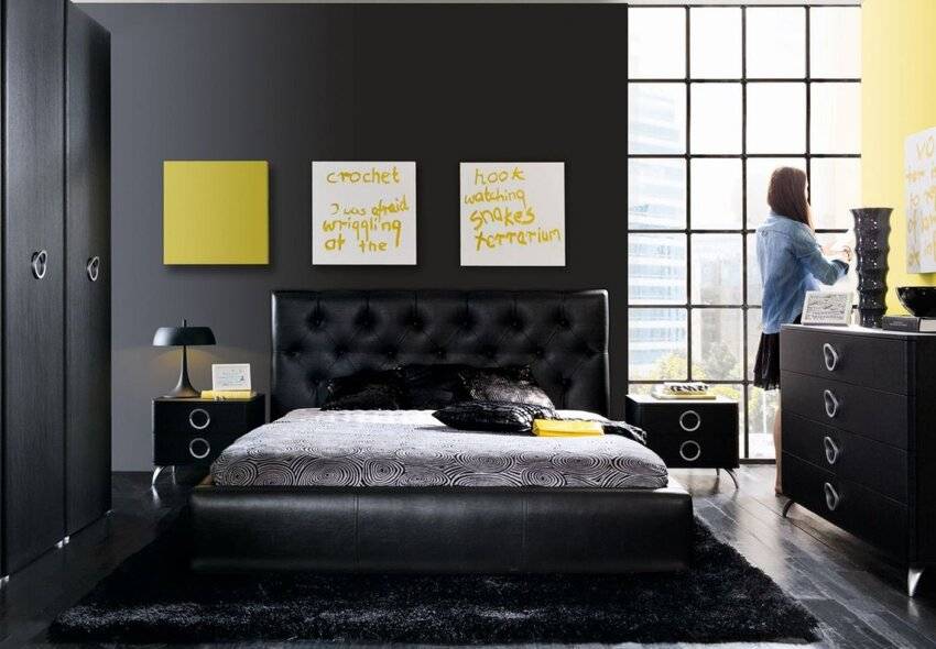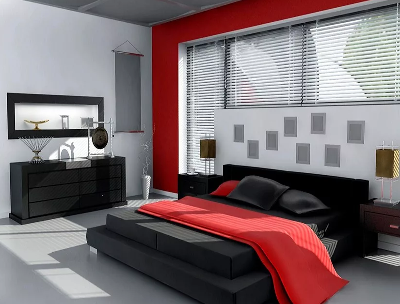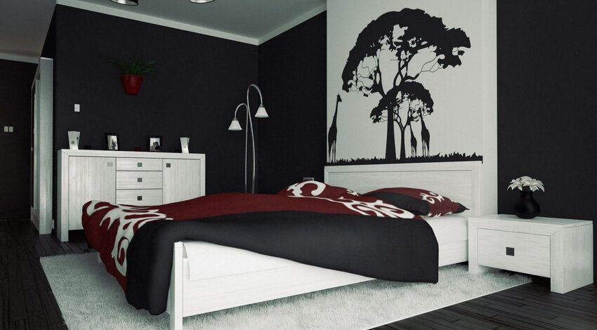 В черном варианте оптимальным решением будет добавление 2-3 цветов. Красные покрывала с ярким рисунком или серые подушки, для добавления контраста с черным и белым цветом. Также контраст может придать пестрая картина на стене.
