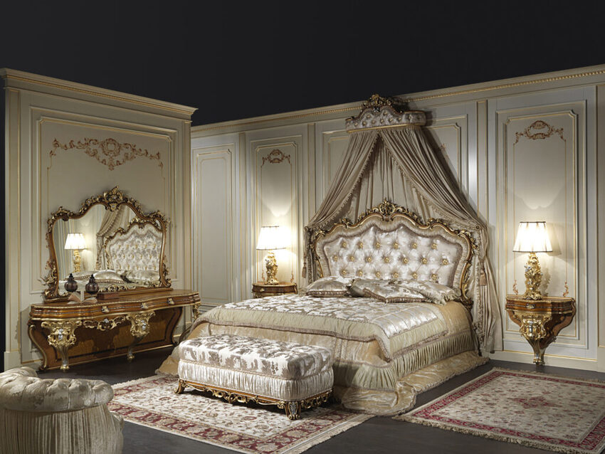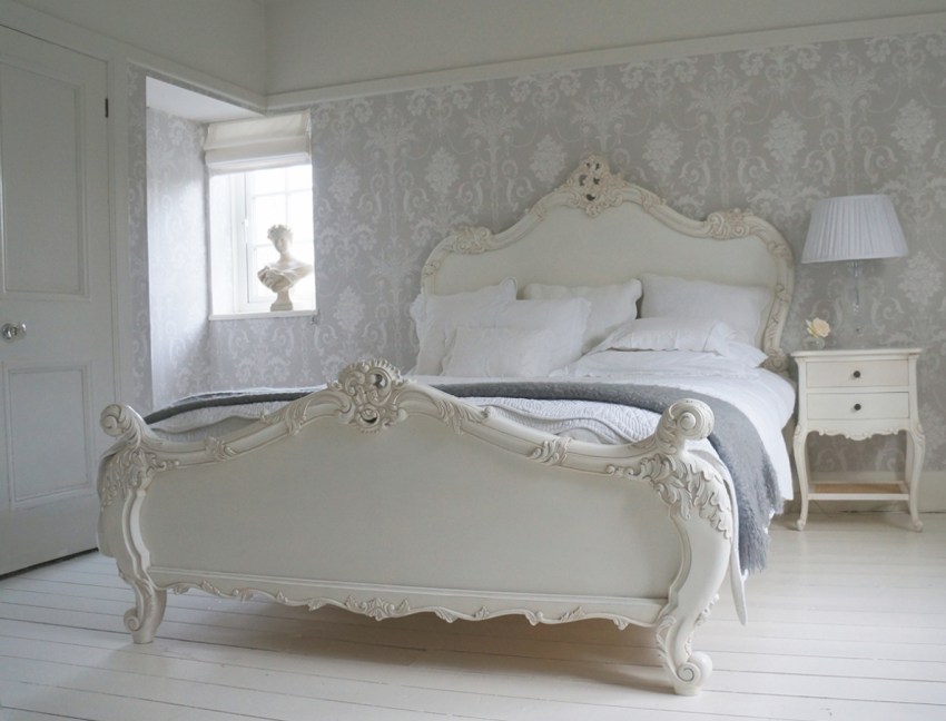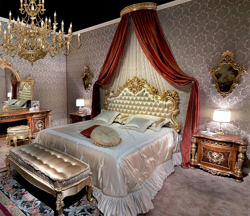 - подберите тяжелую мебель, украшенную резьбой и инкрустациями. Кровать должна быть с высоким деревянным изголовьем;