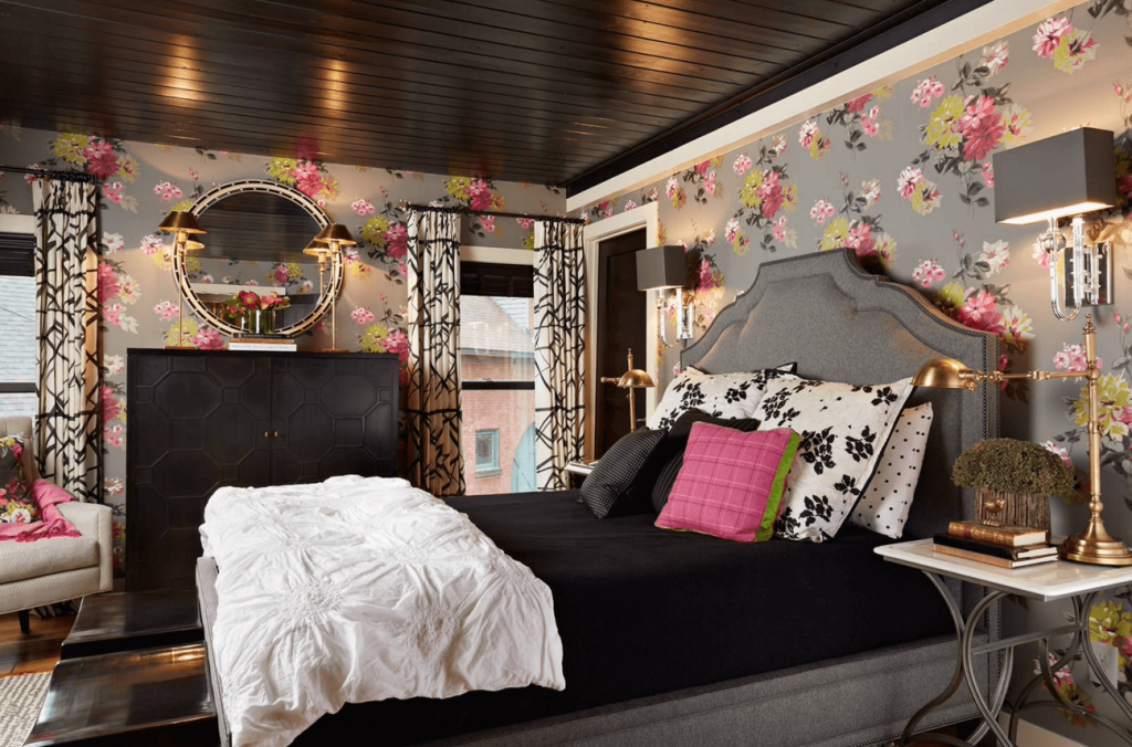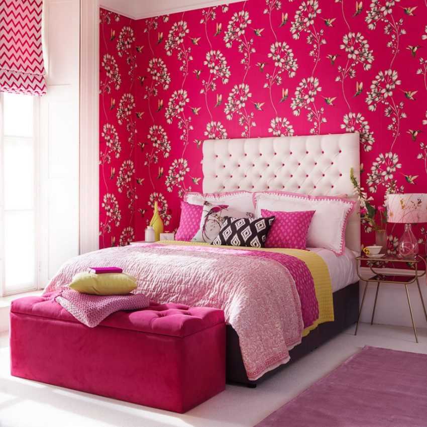 Стены однотонные за исключением той, к которой примыкает изголовье кровати. Здесь наклеивают обои с ярким цветочным рисунком.