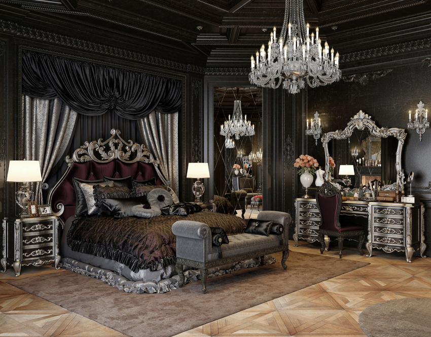 Стиль барокко и необарокко — это всегда роскошь и богатство. Эффектно будет смотреться большая кровать с балдахином, покрывало с бахромой или кисточками. Черный цвет в таком интерьере можно сочетать с фиолетовыми и кремовыми оттенками. Золото также будет уместно.