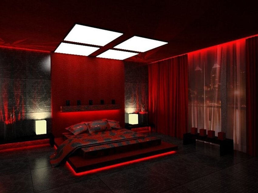 Придать дизайну некой нестандартности можно за счет экспериментов со скрытой подсветкой. Чтобы добиться необходимого эффекта, светодиодную ленту прячут под потолком, а кровать или подиум декорируют встроенными светильниками.