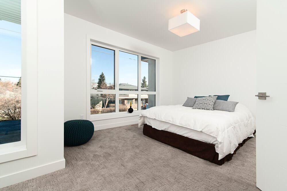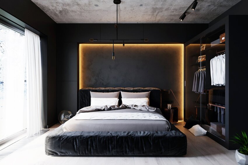 В данном стиле перегружать спальню темными тонами нельзя. Стены практически всегда белые. В основе, конечно, черный и белый цвет, но их допустимо разбавить насыщенным серым оттенком. Например, это будет пол либо одна стена. Уместно впишется черная кровать.