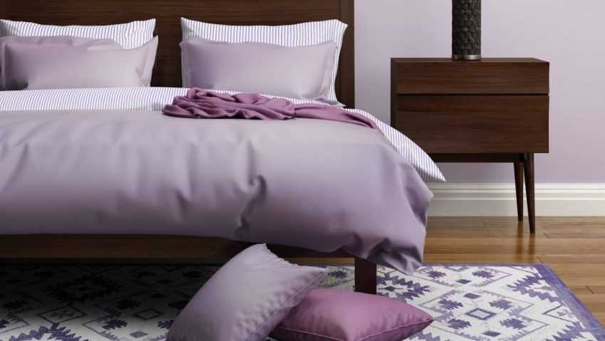 Не стоит сочетать лиловый с ярким синим и красным. Это создаст негативную атмосферу, что совсем не характерно для спальни. Если комната небольшая, нежелательно покупать особи с крупным рисунком. Лучше предпочесть однотонные или с некрупным нейтральным принтом.