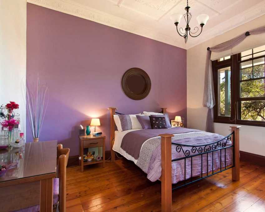 Сиреневый цвет визуально «съедает» пространство, а потому его лучше использовать в просторных по площади спальнях. Если же комната маленькая, то в сиреневых красках можно сделать декоративные элементы или же подобрать более бледный оттенок цвета.