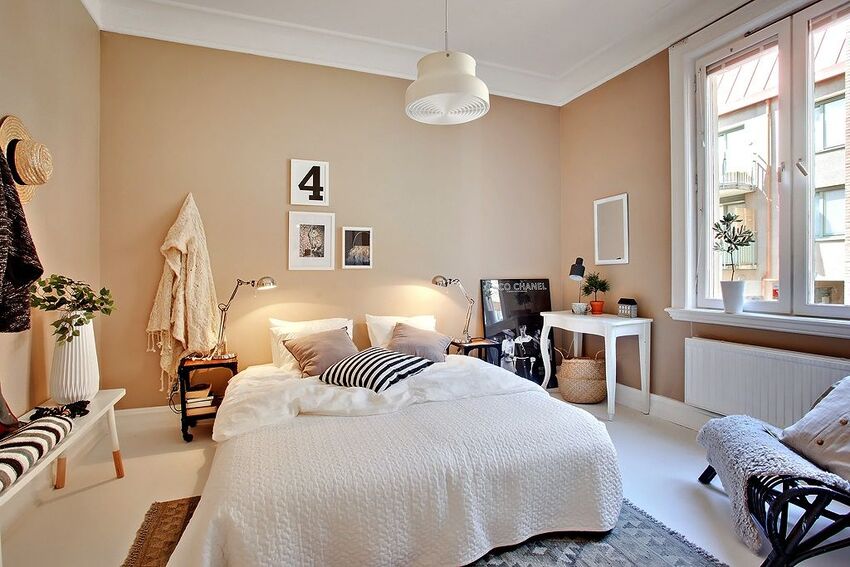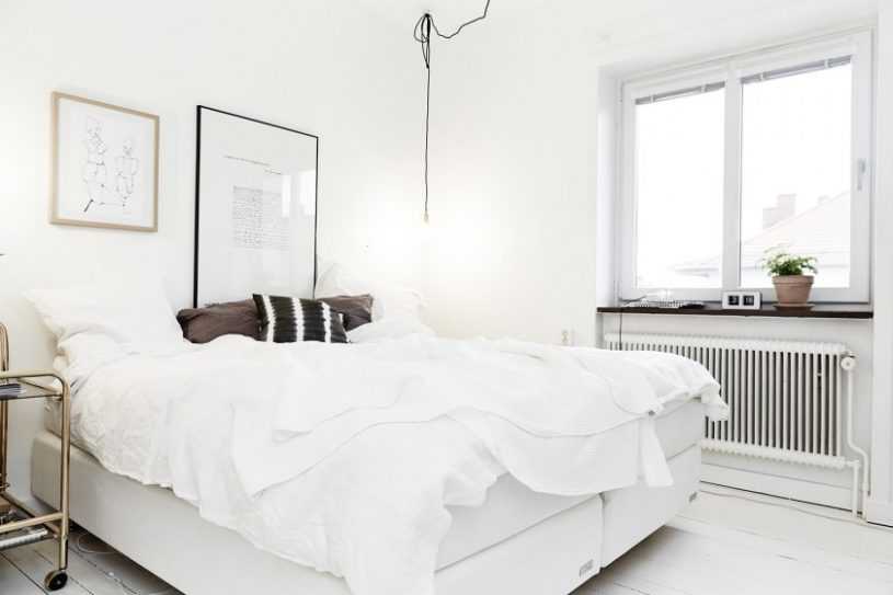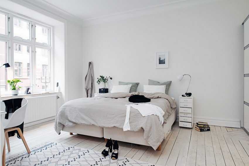 Белый цвет является традиционным для скандинавского интерьера и часто используется как базовый для покраски стен в спальне и отделки других поверхностей.