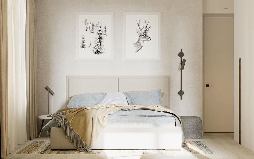 Скандинавские дизайнеры активно используют графический дизайн в оформлении. Яркие постеры, открытки и фотокартины украшают стены спальни.