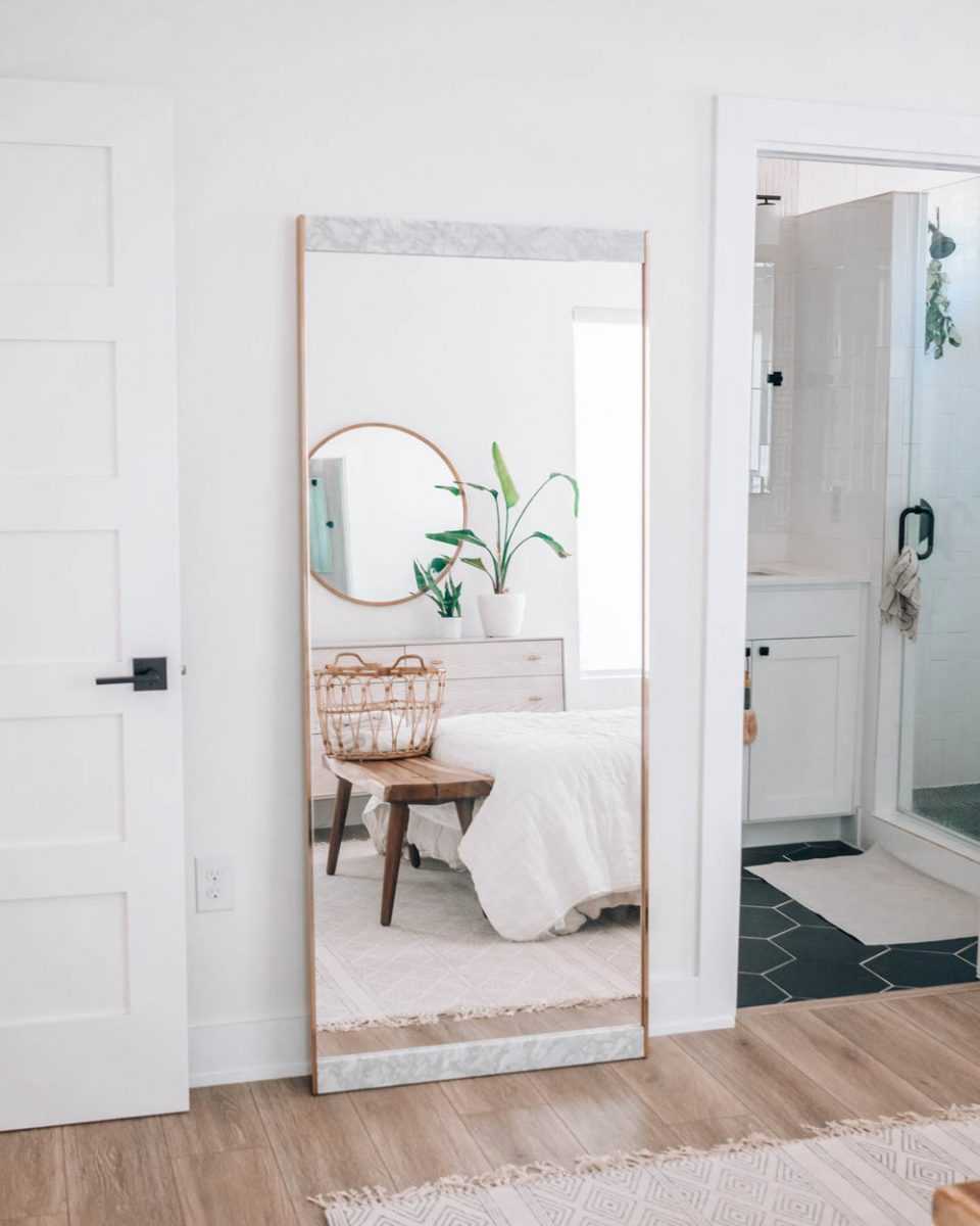 Чтобы визуально увеличить помещение и сделать его более уютным, стоит подобрать зеркало. Модель в полный рост одновременно будет выполнять сразу две функции. Она обеспечит возможность осмотреться перед выходом на улицу, а также будет отражать свет и делать интерьер более светлыми и просторным.