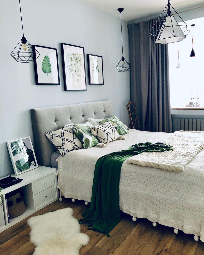 Зеленый является одним из фаворитов при оформлении помещения в скандинавском стиле, но все же уступает по популярности белому. Светло-зеленый фон разбавляется темно-зелеными элементами: шторы, покрывало, плафоны световых приборов.
