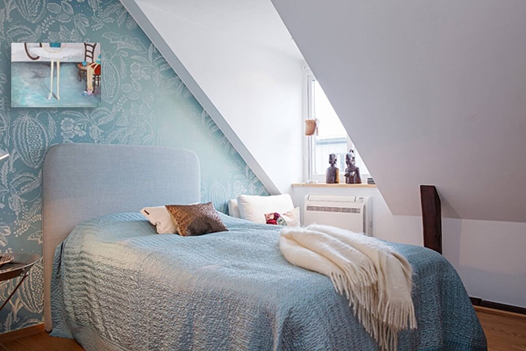 При размещении на стенах картин, акцентировать внимание желательно на их удлиненной форме. Такой прием оформления интерьера спальни на мансарде удачно подчеркнет объемность пространства