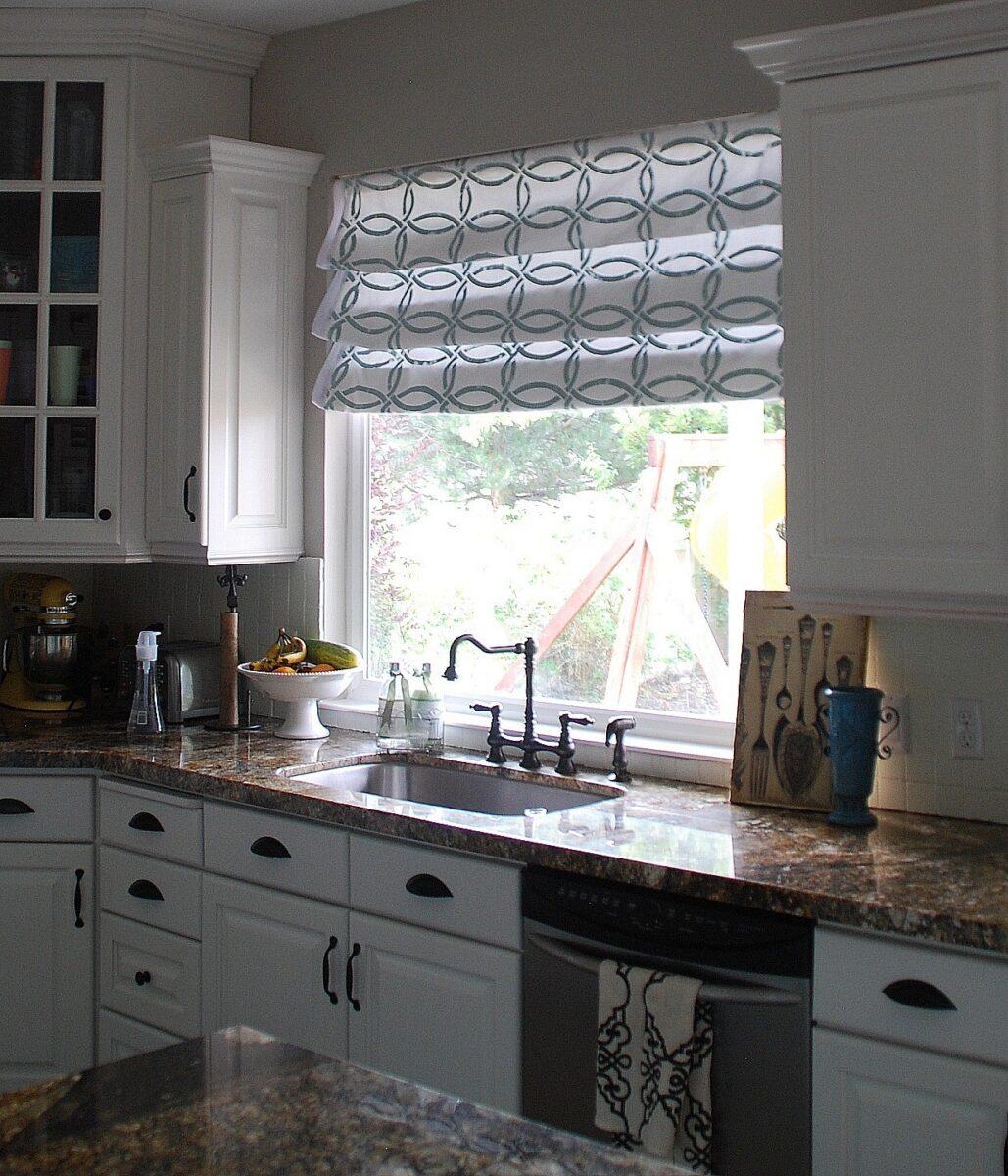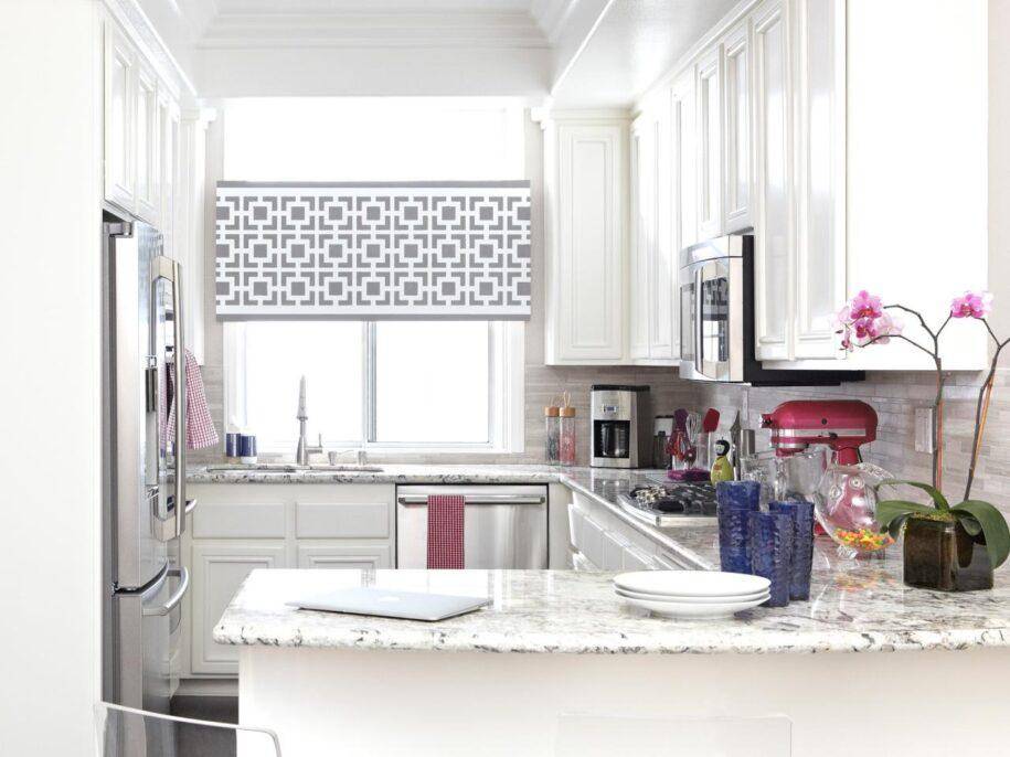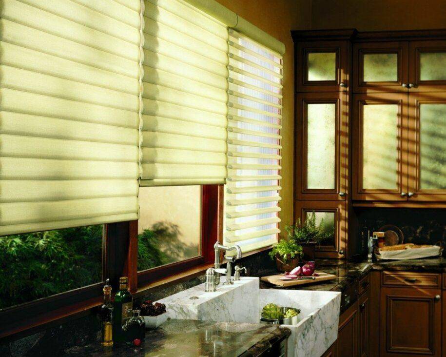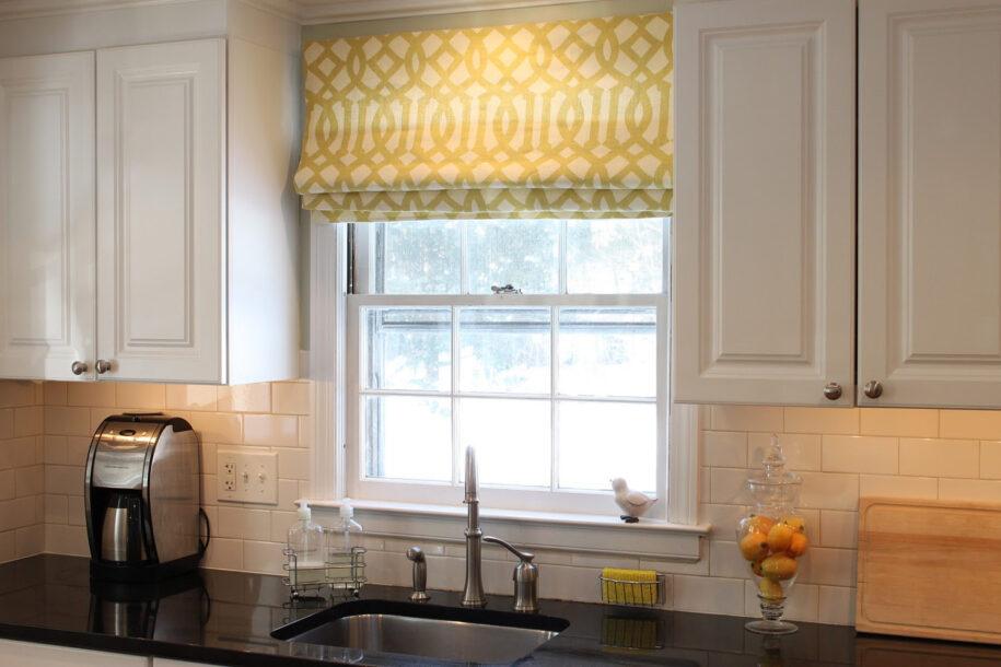 Один из беспроигрышных вариантов оформления окна на кухне — римские шторы. Внешне это тканевой полотно, которое драпируется при подъёме. Шторы крепятся к карнизу и имеют подъёмный механизм. Римские шторы гармонируют с любым стилем, также они являются решением для маленькой кухни.