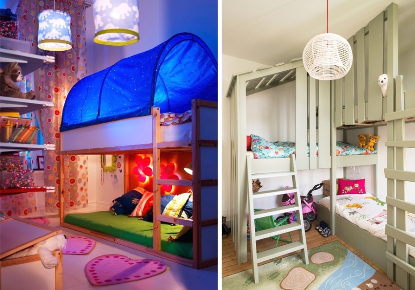 В спальне для троих разнополых детей будет уместным зонирование ширмами, шторами или перегородками из гипсокартона, которые можно использовать для отделения места для переодевания. При отделке комнаты в основном учитываются возрастные особенности. В детской для маленьких детей есть возможность установить рядом друг с другом целые грядки и выделить их тела определенным цветом.