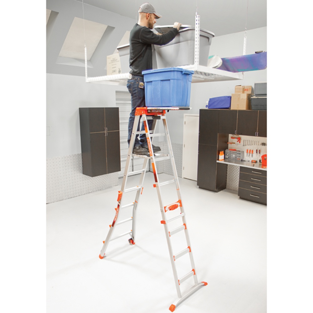 - лестница-трансформер отличается сложной конструкцией на шарнирах, благодаря чему может использоваться как обычная приставная лестница, классическая стремянка или подмости. Высота при этом также, как правило, регулируется.
