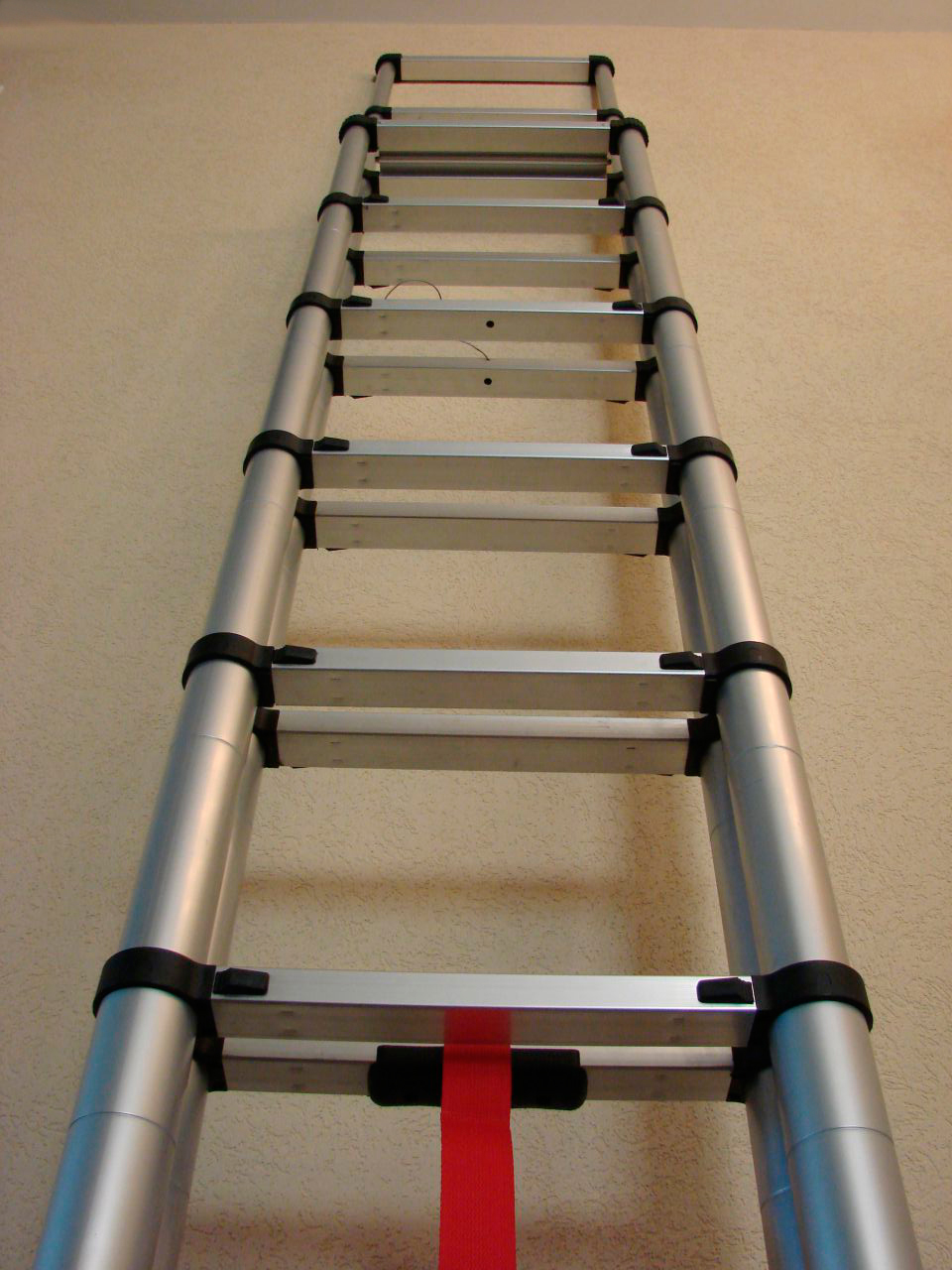- телескопические стремянки оснащаются выдвижными ножками, что позволяет точно отрегулировать положение лестницы на неровной поверхности. Удобно и практично, но имейте в виду, что стоить такая лестница будет дороже, чем аналог той же высоты, но без телескопических ножек, да и весить она также будет больше. Всему виной – более сложная конструкция;