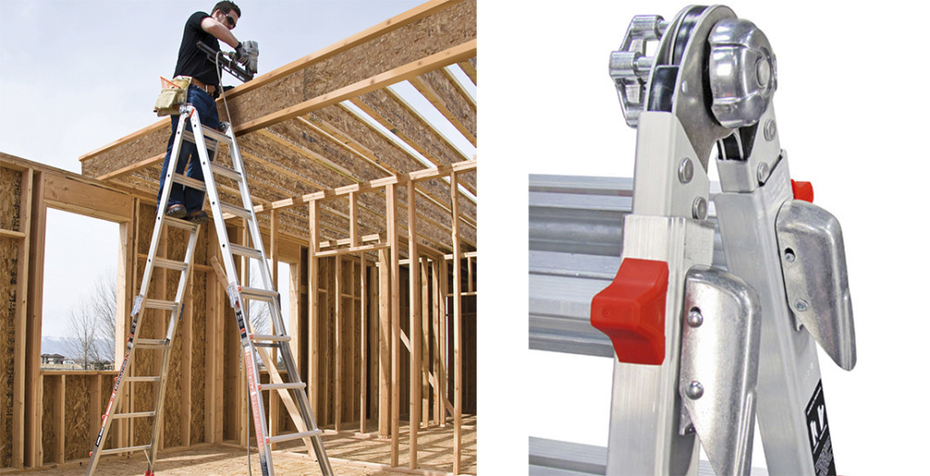 Отдельной категорией стремянок выпускаются модели с дополнительной выдвижной секцией. Это нечто среднее между стремянкой и многосекционной лестницей. Такие подъемы имеют подпорку, как у стремянок. При этом со стороны главных ступенек предусмотрен еще один выдвижной пролет, благодаря которому высота подъема увеличивается практически вдвое!