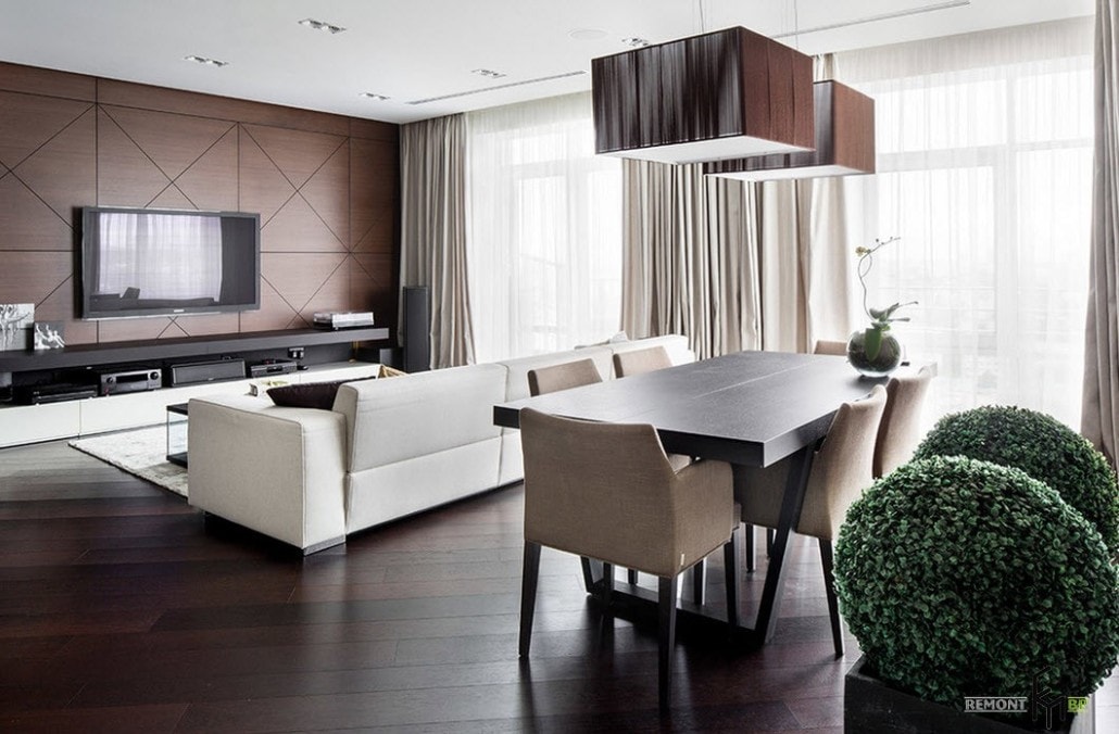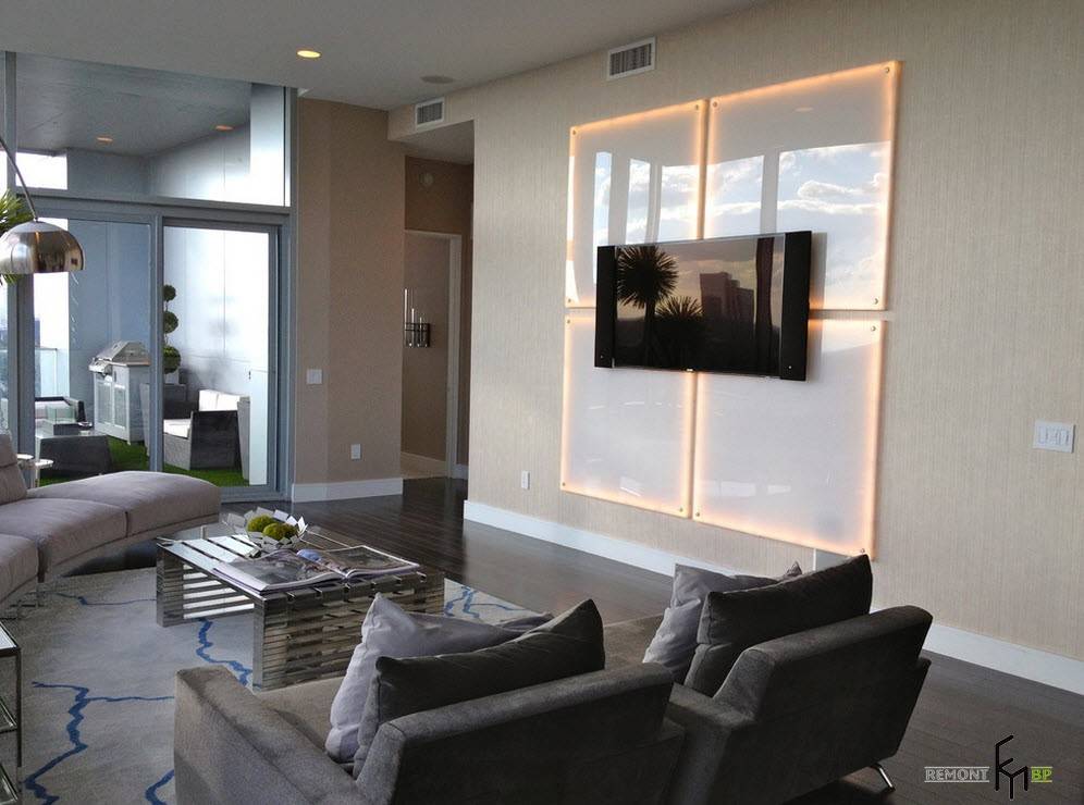 Данный стиль особенно предполагает наличие технологий актуальных времени. Плазменная панель на правильно и красиво оформленной стене, будет прекрасно соответствовать модному и современному дизайну, сочетающего в себе оригинальный внешний вид и функциональность.