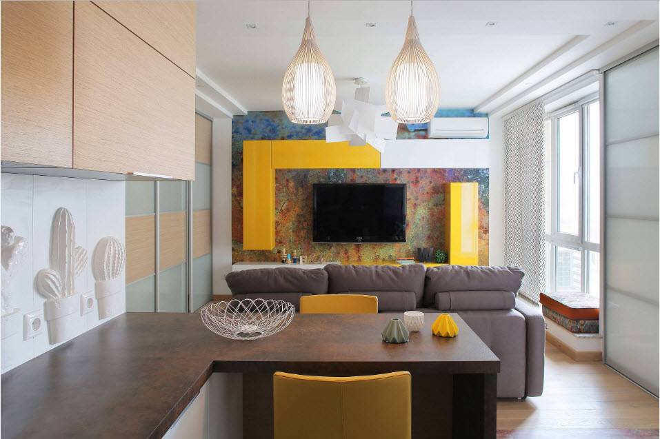 В отделке стены между оконными проёмами используют панели, рельефную штукатурку, узкие прямоугольные барельефы (в 20 см над экраном), картину или плакат. Пространство под техникой занимает тумбочка, комод с декоративными элементами на ручках ящиков или дверец.