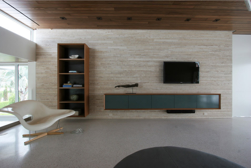 Чаще всего телевизор располагают у самой длинной стены комнаты, кроме тех случаев, когда стены гостиной имеют дверные или оконные проемы, а торец стены остается единой конструкцией. Иногда в стенах гостиной имеются ниши. Они являются самым лучшим местом для размещения телевизора. Туда же можно поставит мягкую мебель, столик. В том случае, если гостиная поделена на отдельные функциональные зоны, то зона телевизора проектируется следующим образом: сам телевизор размещается в центре зоны, а обратная его сторона закрывается небольшим шкафом или стеллажом.