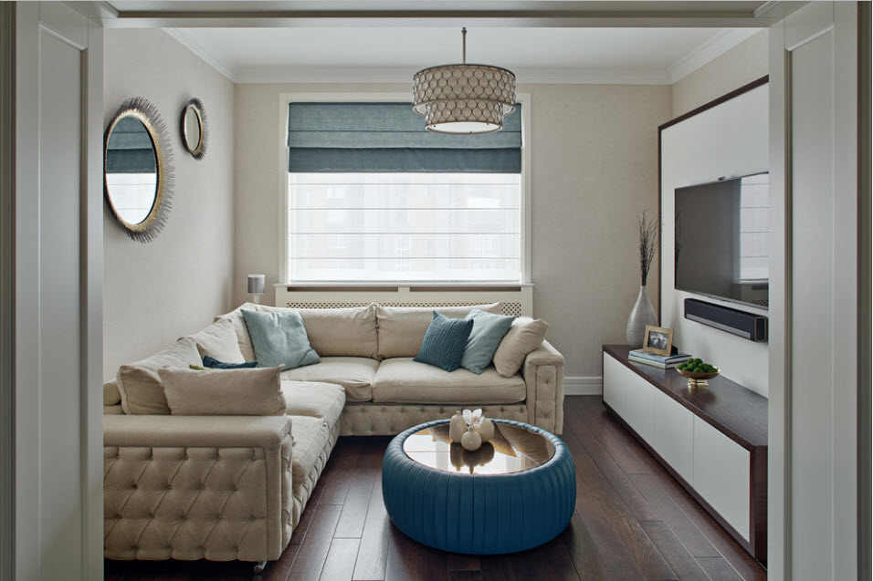 В углу – вариант для малогабаритной квартиры, где каждый метр на счету. Телевизор ставят или закрепляют диагональ на кронштейн над угловой тумбочкой или столиком с небольшими статуэтками или незажженными свечами. В противоположном углу расставляют полукругом мягкую мебель: три кресла с журнальным столиком в центре или диван.