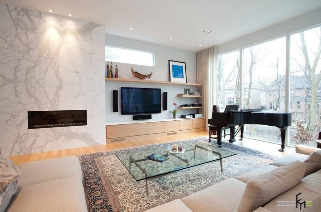 - В сочетании с камином . Тут ситуация следующая: и камин, и телевизор считаются местом сбора всей семьи, и их нахождение друг возле друга или друг над другом создает ощущение дисбаланса. В этом случае рекомендуется разделить каминную и ТВ-зоны, создав в комнате две локации для отдыха. Второй вариант — совместить два объекта, если вместо настоящего у вас современный электрокамин. При этом монтировать телевизор нужно над камином на расстоянии не менее метра.