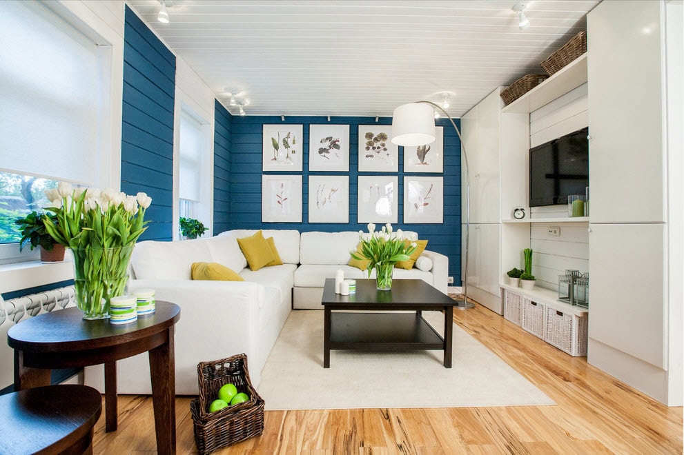 Отделка фрагментами лучше всего смотрится в маленьких гостиных, где учитываются степень и способ освещённости помещения, размер комнаты.
