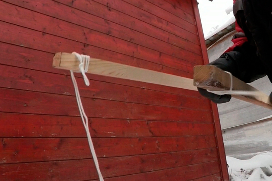 - Веревка перебрасывается через конек, затем два человека используют ее, как двуручную пилу, постепенно перемещаясь вдоль конька крыши, очищая ее.
