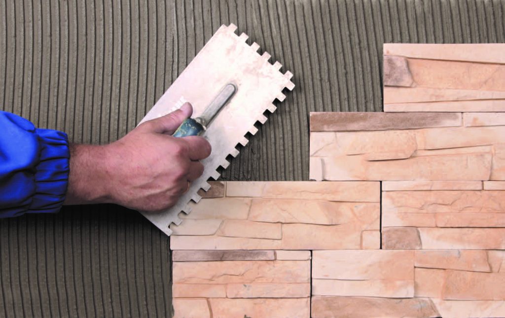 порция клея наносится на плитку с тыльной стороны, равномерно распределяется по поверхности, излишки убираются гребенкой соответствующего размера