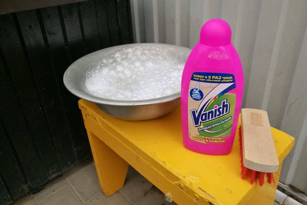 На баллоне подробно описано, как пользоваться этим «Ванишем» для ковров, и нужно следовать этой инструкции: