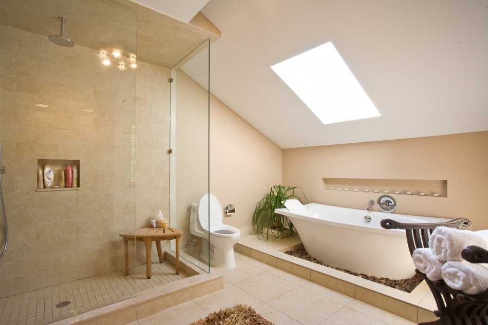 Освещение тоже делают встроенным: используют ниши в стенах, подсветку над зеркалами и точечные светильники. Свет над ванной должен делиться на зоны.
