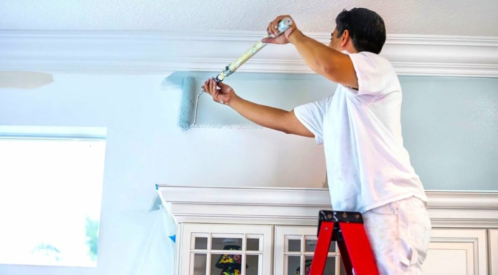 Потолок и высокие стены красят валиком, надетым на длинную штангу.