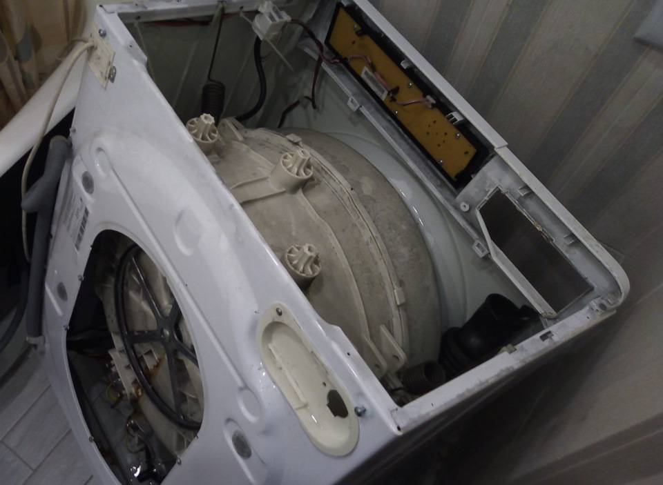 Получаем перед собой машинку такого вида. Тут нужно открутить малый противовес, что бы было легче вытаскивать корпус барабана.