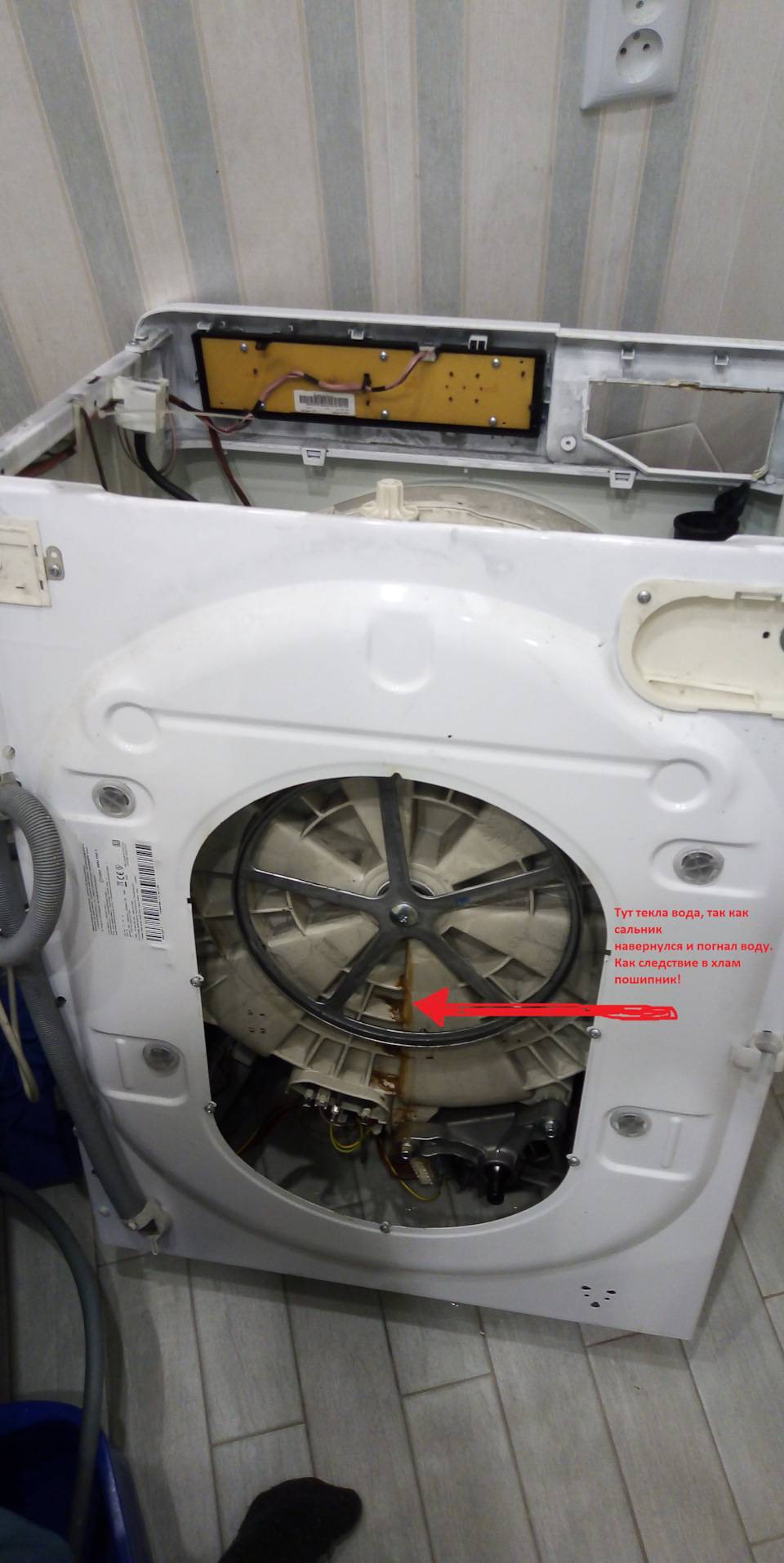 Для проверки состояния подшипников следует вручную провернуть барабан. При исправных подшипниках барабан должен вращаться свободно. Если подшипники повреждены, ход барабана будет натужный и прерывистый. Также о повреждении сальников и подшипников могут свидетельствовать ржавые либо маслянистые потеки на внутренней части корпуса стиральной машины.