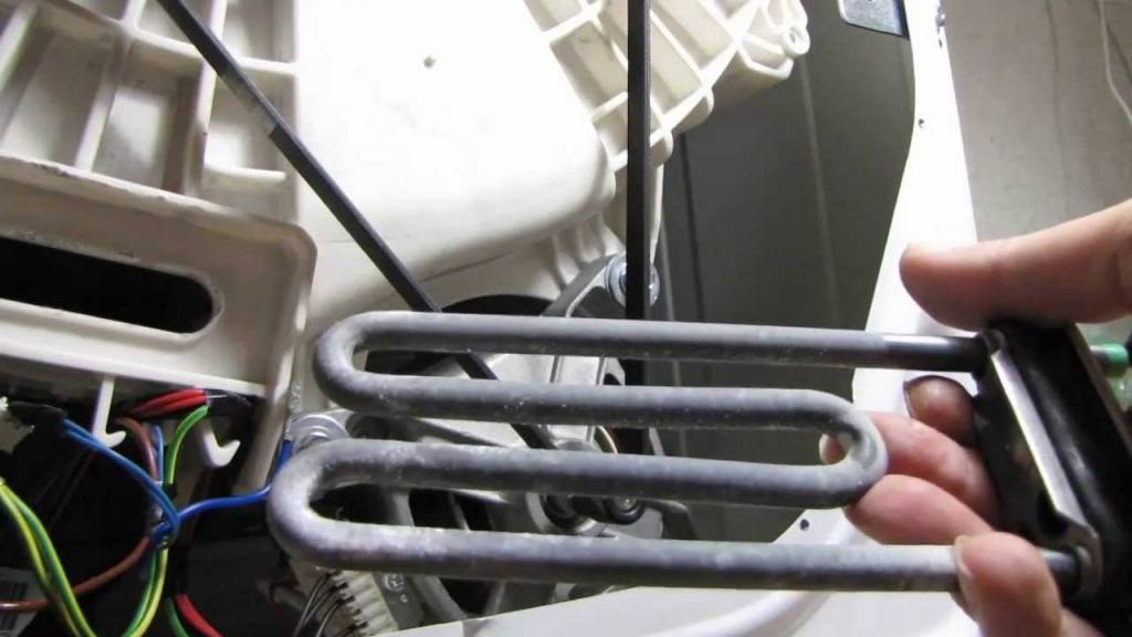 Извлечение нагревателя из машинки может затрудниться наличием на нём большого скопления накипи и поэтому нужно это делать осторожно, чтобы не повредить посадочное место тэна.
