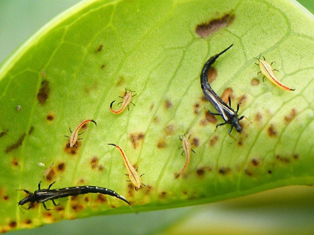 Определить появление трипсов на растении можно по его внешнему виду. При заражении, на листьях растений появляются темные пятнышки и серебристая пленка. Такое изменение связано с тем, что в самих листьях насекомые откладывают яйца, из которых, впоследствии, появляются личинки. Они очень малы и их практически нельзя обнаружить.