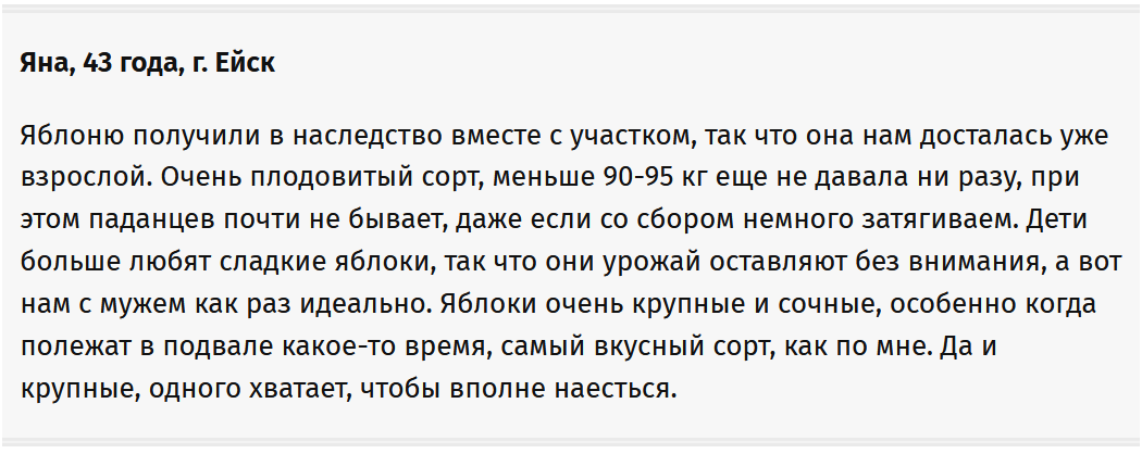 Один из старейших и популярнейших сортов среди садоводов. Урожайность высокая, но может отличаться некой периодичностью. Молодые саженцы не плодоносят не раньше 5-6 лет после высадки