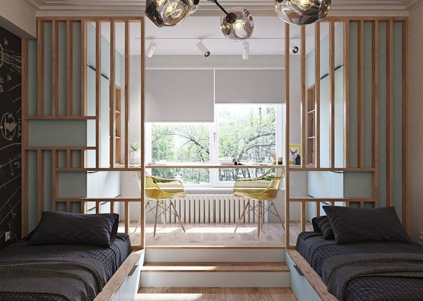 Важно приспособить такой интерьер под увлечения ребенка. Цвета могут быть самыми разными, их обычно разбавляют белым.. Отделение рабочей зоны от зоны отдыхаИсточник pdhome.ru