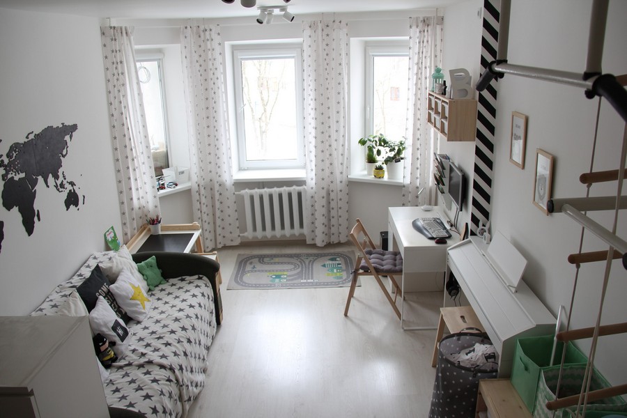 В этот возрастной период стоит сделать акцент на игровой части, занимающей большую часть детской. Для мальчика, как и для девочки в этом возрасте важна физическая активность — в игровой зоне стоит расположить спортивную стенку. Детям нужно выделить и место для самовыражения/творчества. И организовать комфортное пространство для сна.